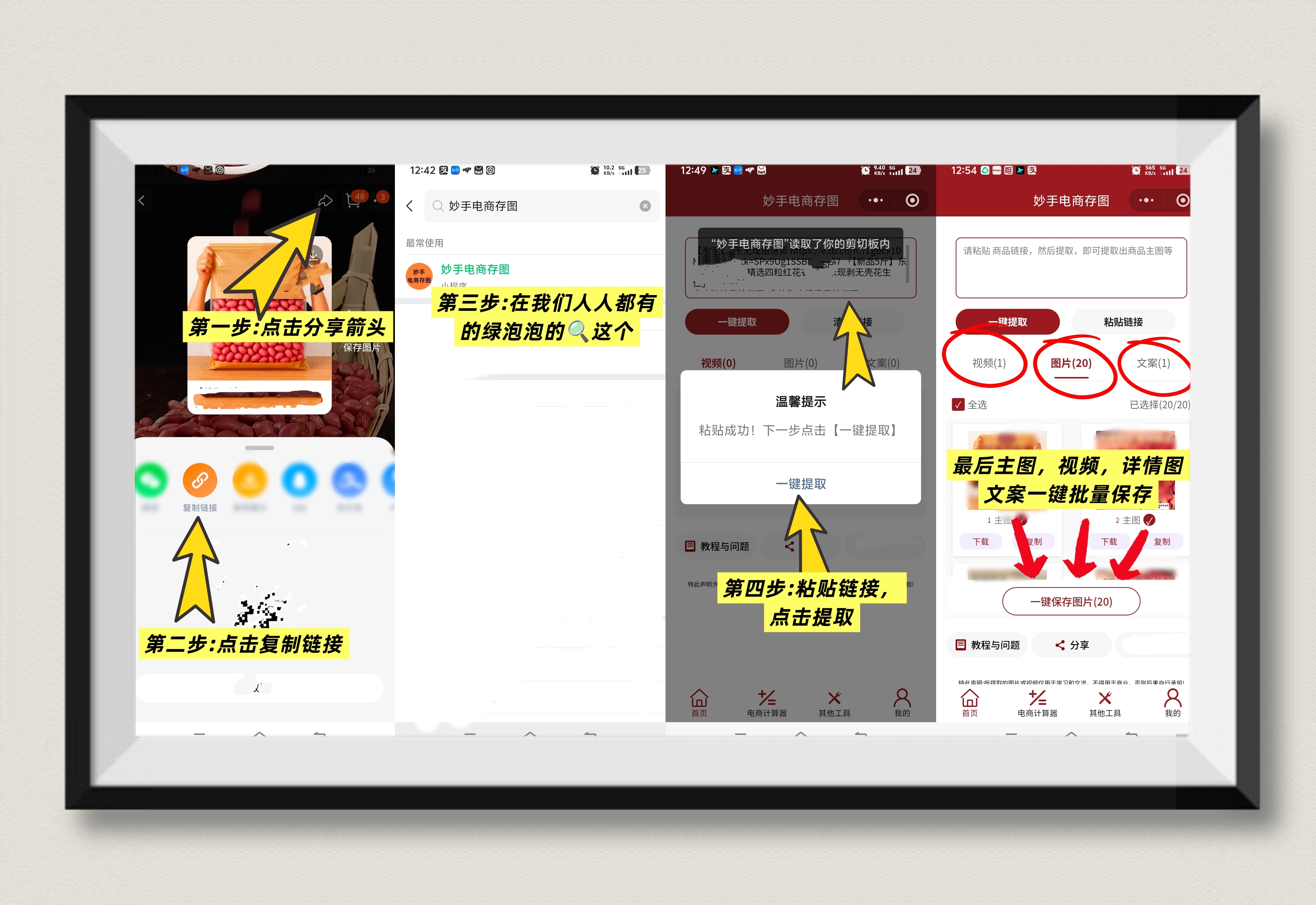 操作超简单,复制商品的链接,打开妙手电商存图(是某信的小城虚),把链接粘贴进去,一键就能导出保存,全程不用复杂操作,新手也能秒会。