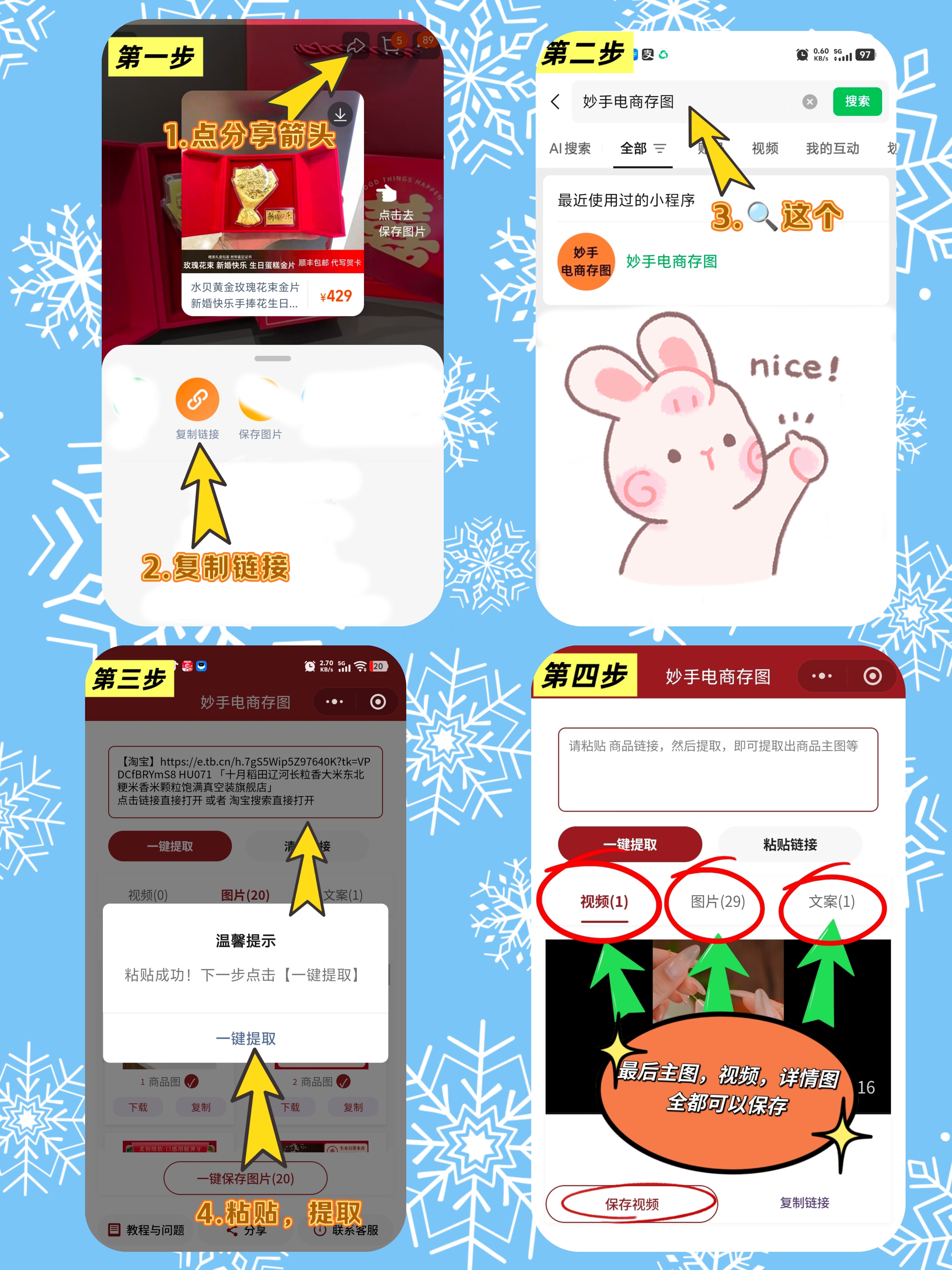 不用再折腾复杂的代码或插件,用【妙手电商存图】就够了。操作步骤特别简单:在某信搜【妙手电商存图】,进入后,复制1688任意商品的链接,粘贴进去就能选择提取主图、SKU图、详情图,甚至是主图视频,而且提取后还会自动分类整理,不用自己手动筛选,省了超多时间。